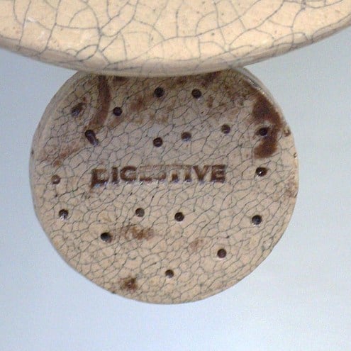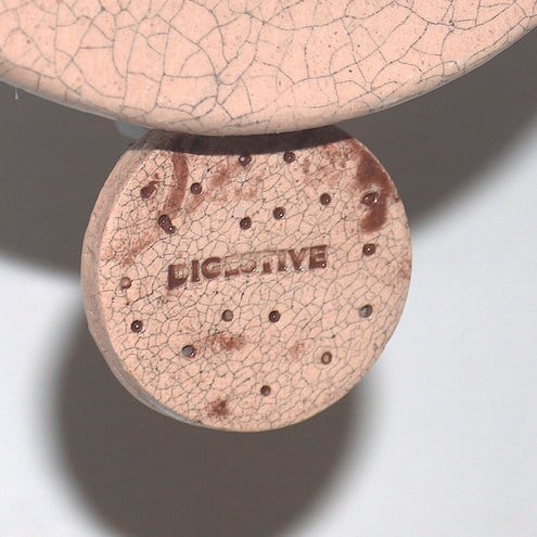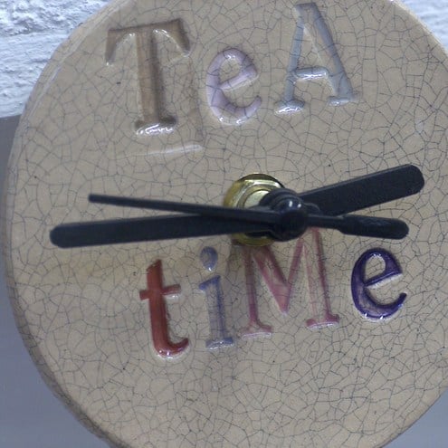 This is another one of my little pendulum clocks. The words 'Tea Time' are embossed on the face of the clock with my vintage stamps, all in different coloured underglazes. The litle pendulum is a digestive biscuit, which swings from side to side as the clock goes about it's business. The whole thing is finished in my trade mark crackle glaze.