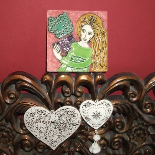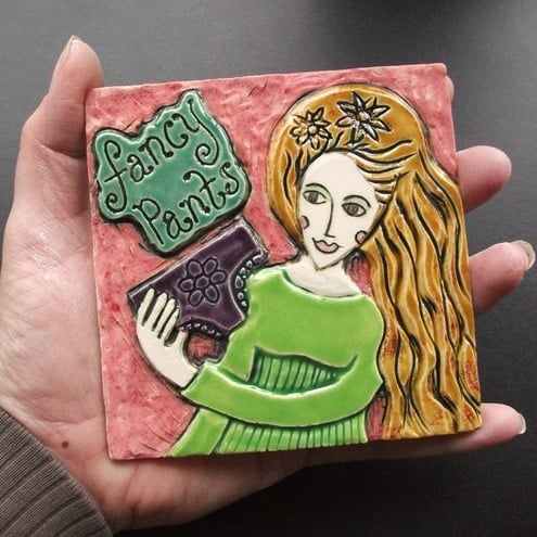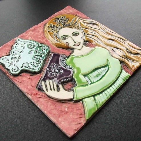 This little tile is made from white earthenware clay and the image has been carved out of the clay. It has been decorated with a variety or rich matte and glossy glazes.