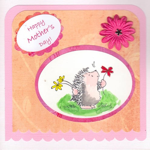 Water-coloured hedgehog holds some brightly coloured daisies. He's layered onto a cerise patterned oval mat which is mounted onto peachy coloured card with self-coloured floral design and then onto pink linen textured card, prettily shaped at the bottom with a threading water edge punch.