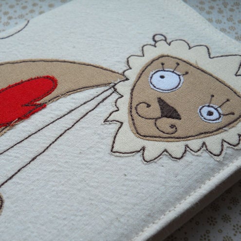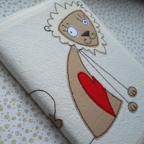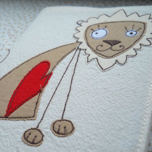 the lion is in a neutral cotton fabric, with red heart on his chest, which is appliqued onto pre-washed calico, before being "drawn" on with free machine embroidery.