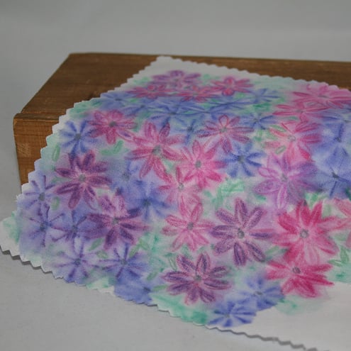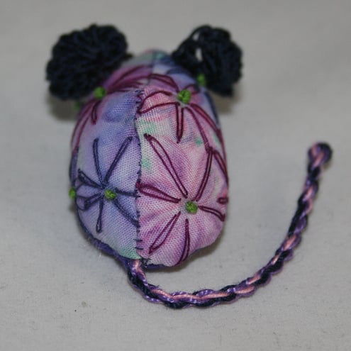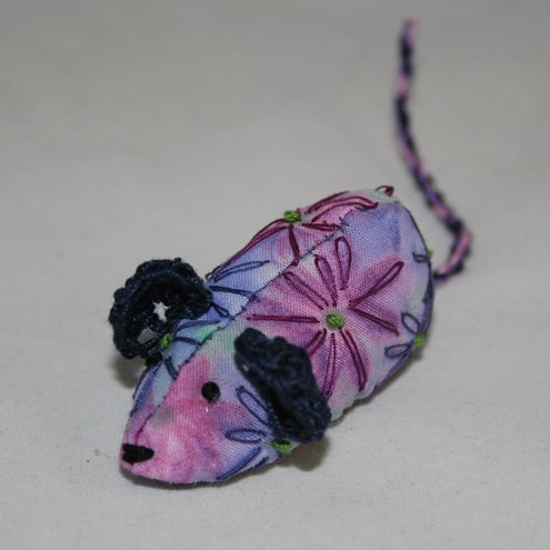 White cotton fabric has been hand painted, and heat set, in a daisy design. The mouse body has been cut from this fabric and embroidered using daisy stitch and French knots. Her ears are crocheted from navy cotton. Her tail is a hand-made cord, twisted from strands of pink, blue and lilac cotton. Her nose and eyes have been stitched in black embroidery thread.