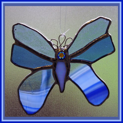 It is a very pretty little butterfly made of lovely bright shades and textures of blue glass. The butterfly's head is a pretty bead and it has 2 wire loops as antennae on top of the head . It hangs from a little loop of nylon thread which is securely attached to the top of the head by a wire ring.