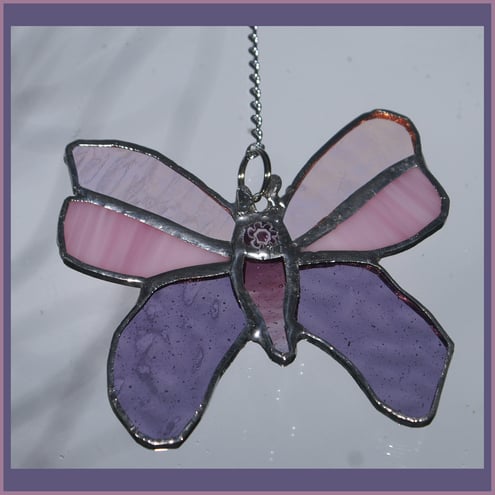 This is a stained glass suncatcher made using the Tiffany copper foil technique.