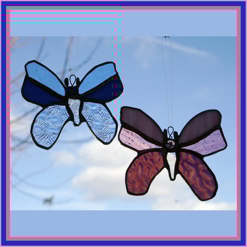 The first photo is of the bright blue butterfly for sale here. The other 4 photos are of some I have made previously. I never make two items the same, I always use slightly different shades and types of glass to ensure uniqueness. Every thing I make is entirely hand-crafted.
