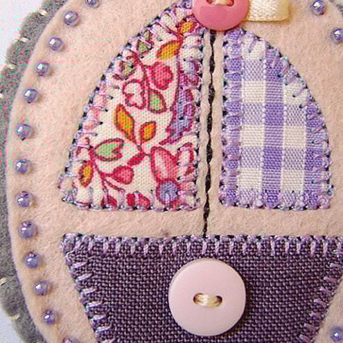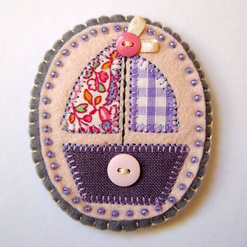 This is a lovely handmade fabric brooch. The brooch features a little appliqued boat design with pretty cotton print sails. It is mounted onto an oval shaped felt base, edged with beads and finished with button details. It has a brooch backing for easy attachment.