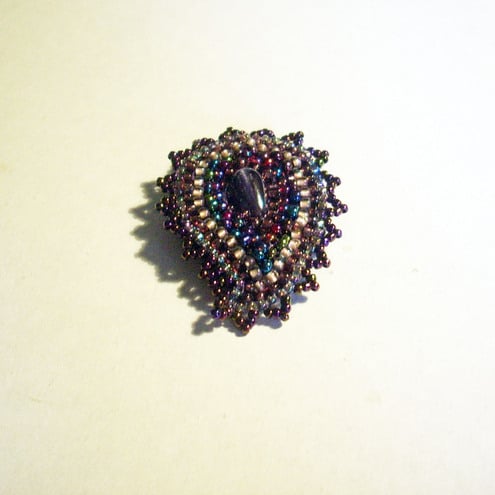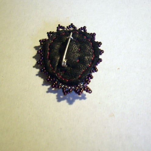 Unusual, richly coloured brooch in shades of red, blue and burgundy with gold accents. I've beaded rows around a central teardrop shaped bead using a design from instructions by Diane Fitzgerald. The brooch is shaped like the paisley designs seen on victorian fabrics and based on an indian or persian design called Amb, Buteh or Buta in various languages. I've read that it's a pine cone a mango seed; although I've never seen a mango seed that shape, or a seed pod. It's a lovely shape and one of the first designs I learned to do with needle bead weaving. The beads are a mixture of vintage and new ones and the edging is a 5 bead picot using tiny size 14 beads in burgundy. Some of my vintage beads have been bought recently and some I've had from new and they've become vintage over the time I've owned them! I've put a backing of black leather on this brooch as it seemed a little soft and it was a little difficult to fasten the pin, which is hand made from sterling silver wire.