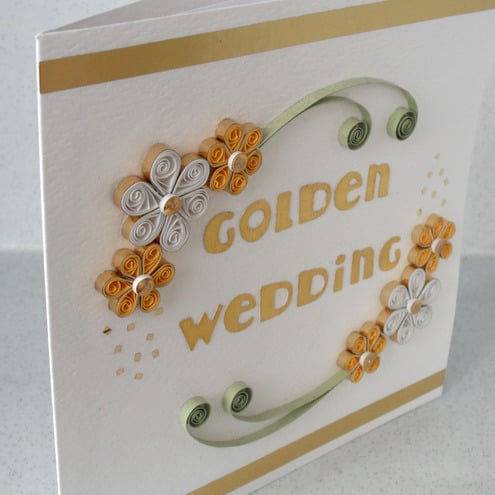 A square white textured background card featuring die cut “Golden Wedding” message in shiny gold, decorated with garlands of gold and white quilled flowers.