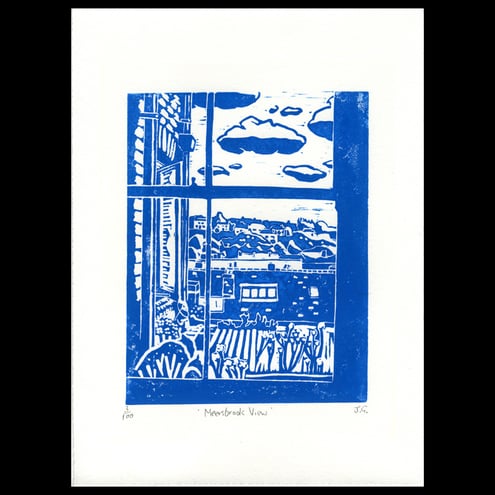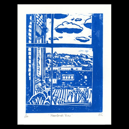 A linocut print entitled 'Meersbrook View'.