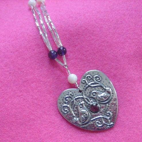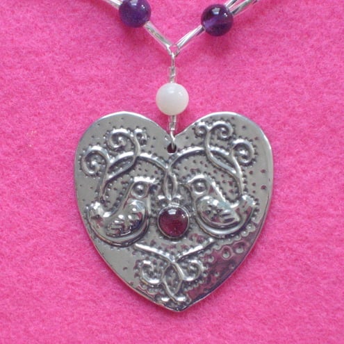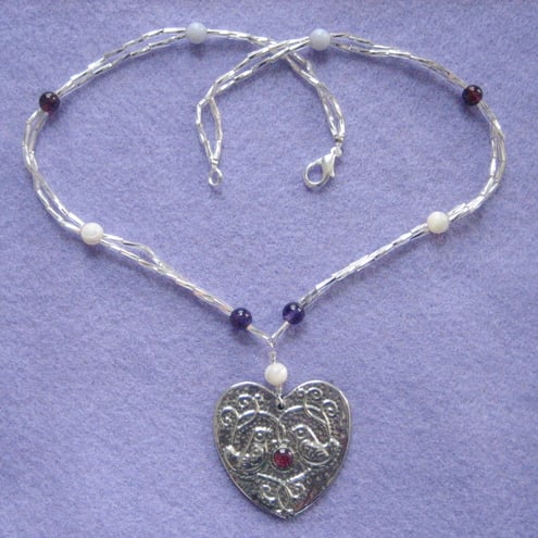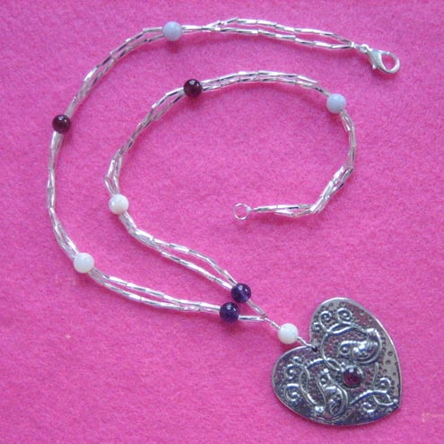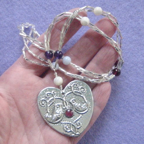 This lovely pendant has been hand-made in modern lead-free pewter, and set with a genuine garnet cabochon. Finished with a mother-of-pearl bead, it has been suspended from a necklace of silvery twisted glass bugle beads with larger beads of amethyst,garnet,blue lace agate and mother-of-pearl.Measuring 45.5cm, it has a silver coloured lobster clasp. The heart shape is 39x39mm. Comes in a gift box.