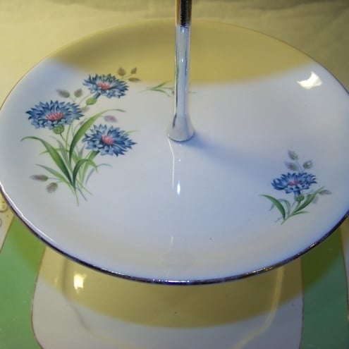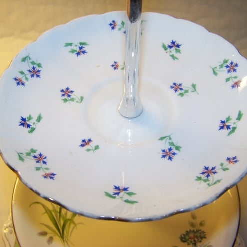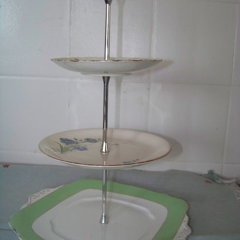 Made of old or vintage plates, this one features a 1950's green cake plate at the bottom and two blue flowery plates on the next layers.