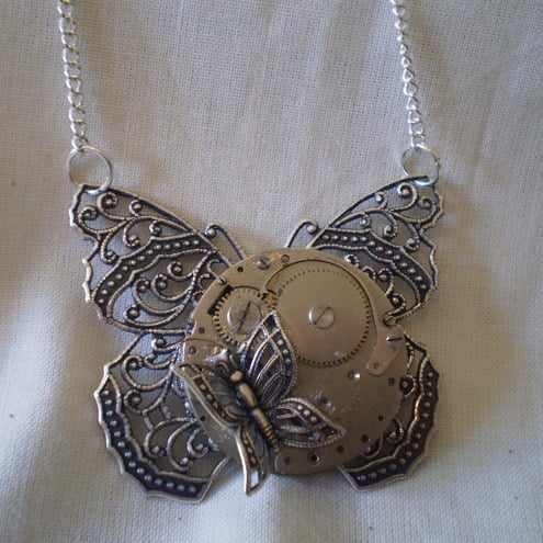 A butterfly has landed to rest on the Vintage watch movement that adorns this lovely butterfly necklace. The watch has been placed on an antiqued silver open work filigree base.