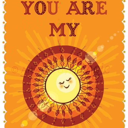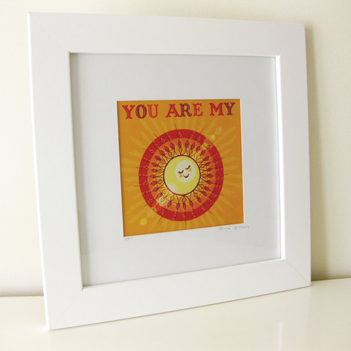 This 'You are my Sunshine' illustration is one of my most popular prints. I've got a limited stock of lovely square white frames (as featured in the photograph here) with mounts cut to fit a 15cm x 15cm print - I thought they'd be perfect to display this happy little image.