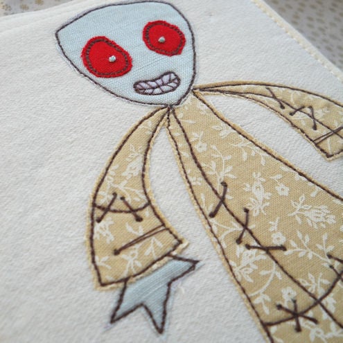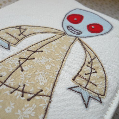 the zombie is in a neutral printed floral cotton fabric, which is appliqued onto medium weight cotton, before being "drawn" on with free machine embroidery, and features hand embroidered eyeballs.