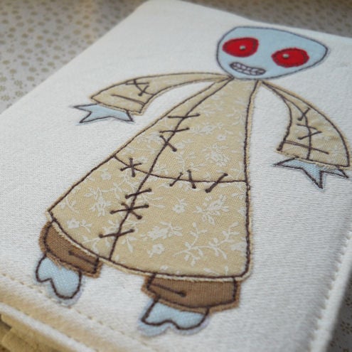 this embroidered fabric notebook features a cute and/or scary zombie tiptoeing toward you on the front cover.