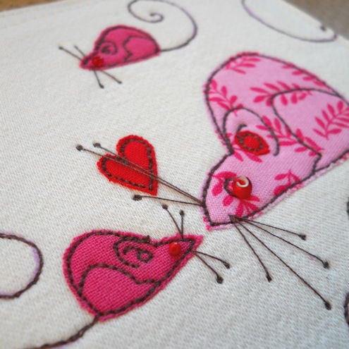 the baby rats are in pink cotton, and mother rat is in floral-printed pink, they are all appliqued onto pre-washed, medium weight cotton, before being "drawn" on with free machine embroidery. they have swirly tails, fine whiskers and beady red eyes made out of …tiny red beads.