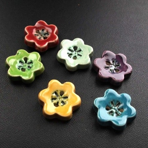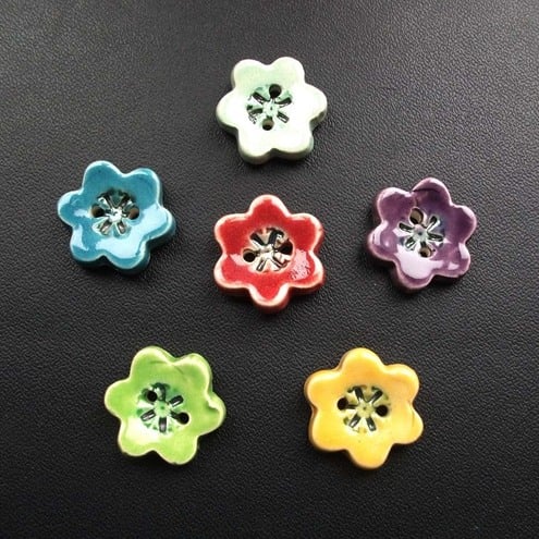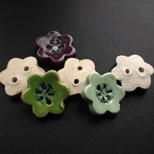 These cute little flower buttons are made from white earthenware clay and twice fired to a top temperature of 1100 degrees, so they are nice and strong.