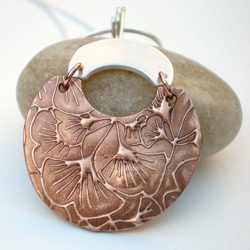 Unusual and very striking copper and silver pendant with a gingko leaf pattern.