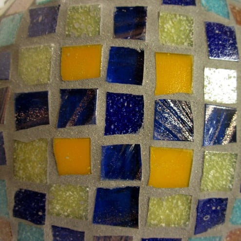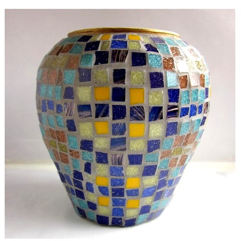 A beige earthenware pot measuring 15.5cm tall and approximately 14cm at it’s widest point. The opening at the top of the pot measures 8.5cm across. The base of the pot measures 7cm. The mosaic is made up of vitreous glass tiles. The colours used are two shades of deep blue, two shades of blue veined with copper, orange, beige, caramel, terracotta, and aqua. The mosaic is finished with a cement grey grout. The rim has been painted with copper enamel paint.