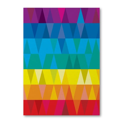 One A6 sized 'Triangles' greetings card. A vibrant retro geometric illustration in lots of rainbow shades.