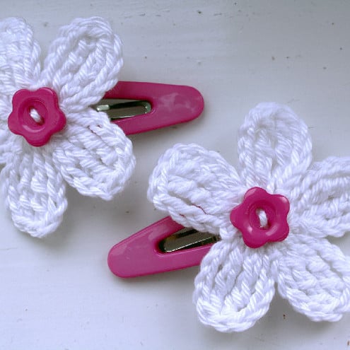 A pair of handmade, gorgeous hair clips with crochet, cotton flowers in WHITE, decorated with charming, jolly pink buttons in flower shape.