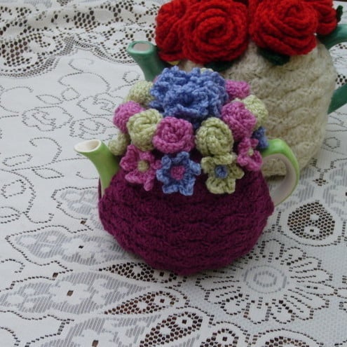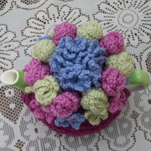 The cosy has been handmade using good quality yarn in a lovely plum colour. The top of the cosy is decorated with a large crochet carnation in lilac. There are ten individual small roses in pale green and pink around the outer edge of the carnation. Pretty little flowers in pale green, lilac and pink with contrasting coloured crochet centres decorate the outer edges of the roses.