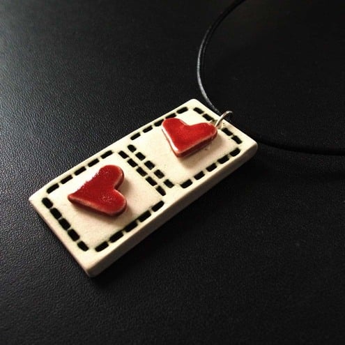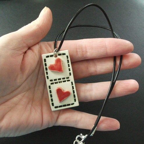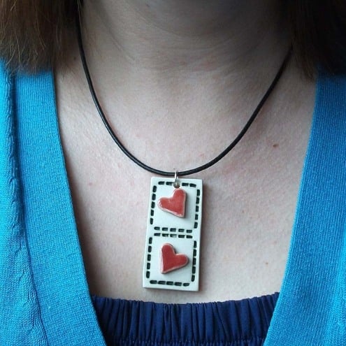 This cute little pendant with twin red hearts is made from white earthenware clay, embossed with a dashed background and glazed with a deep red glaze.