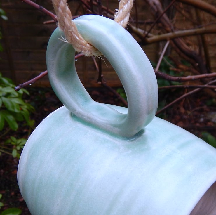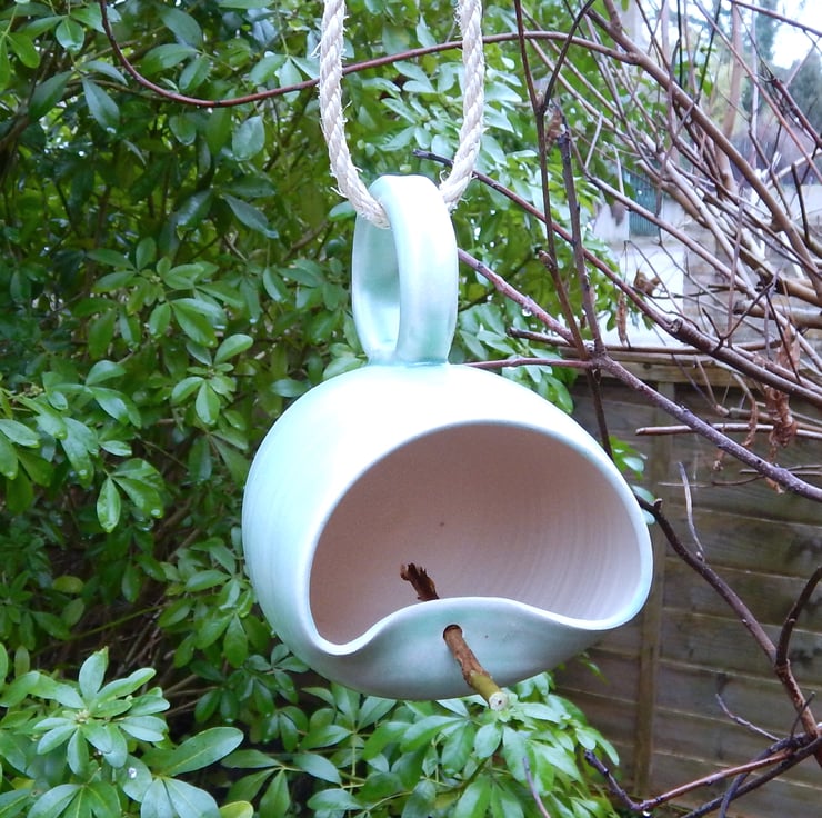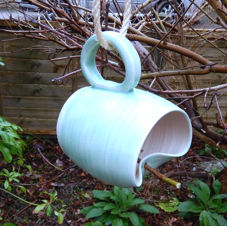 This hanging feeder was thrown on my pottery wheel using strong white stoneware clay in the shape of a large coffee mug then turned on its side. I've added a little perch made out of a twig....easily replaceable if a big bird gets on and breaks it!