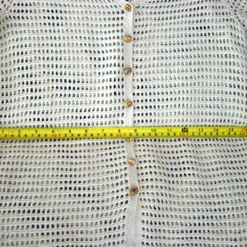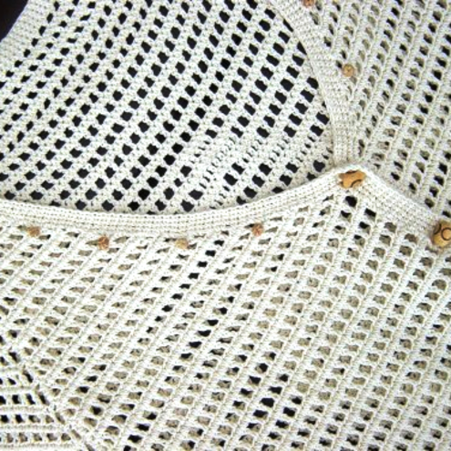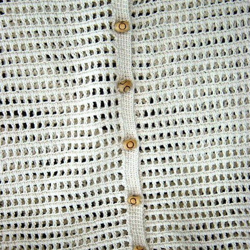 This is a handmade garment. This Jacket has been hand crocheted in 100% cream Cotton yarn and has been embelished with little wooden floral beads around the 'V' neckline and oval tubular wooden beads as buttons.