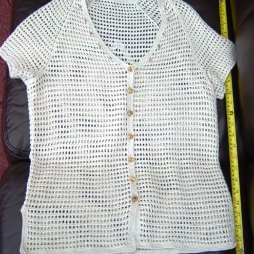 Ladies Hand Crocheted Short Sleeve Jacket, with wooden bead detail and buttons.