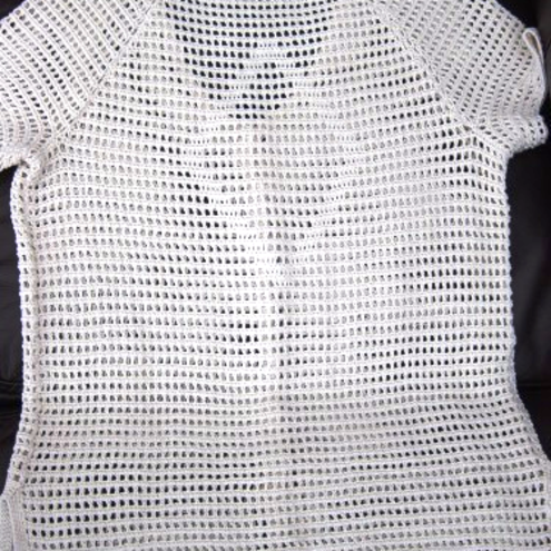 The crochet design is an almost open waffle, or latice pattern, quite geometric, on the back there is a crocheted diamond shape, to mirror the shape of the 'V' neckline.