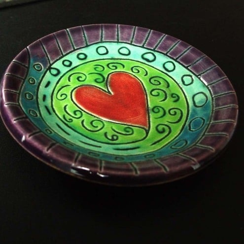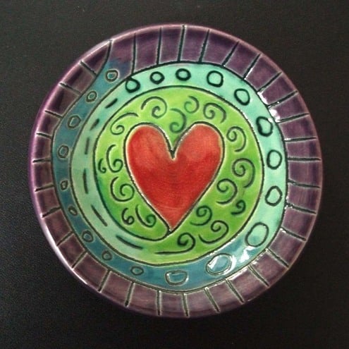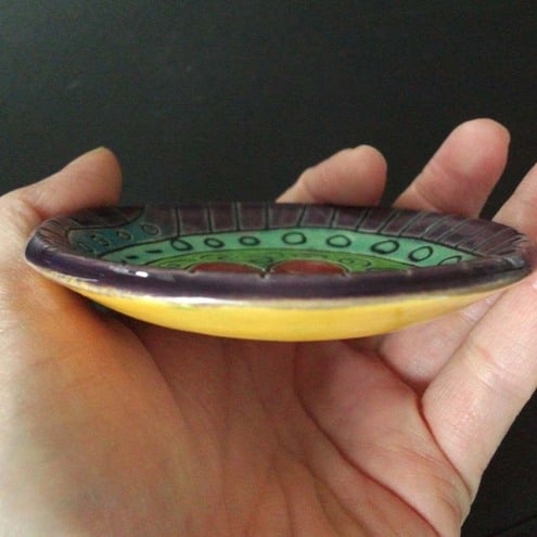 This cute little dish is made from white earthenware clay and decorated with lots of richly coloured glossy glazes.