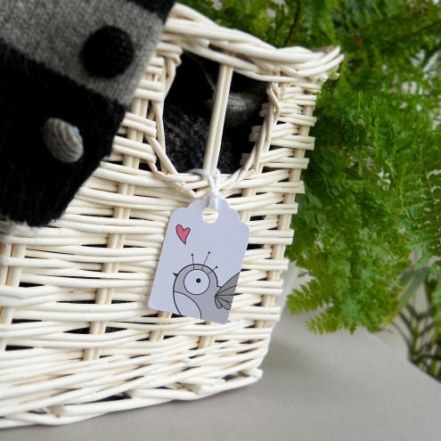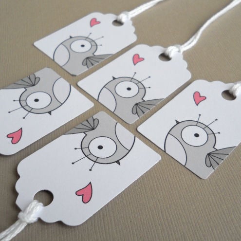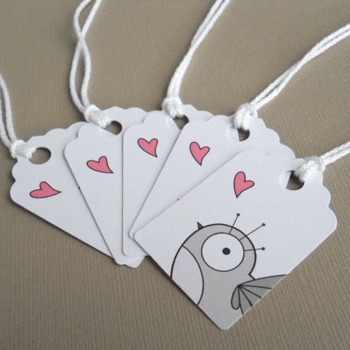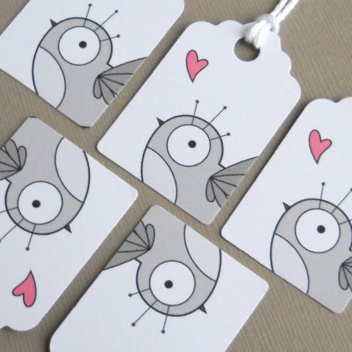 a little pack of 5 tags, featuring a little grey bird and a pink heart. cute and quirky, and great to use for decorating, labelling or as gift tags.