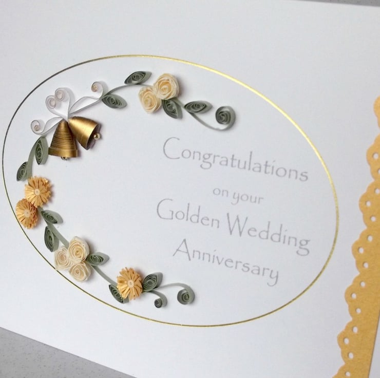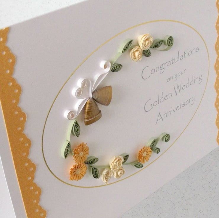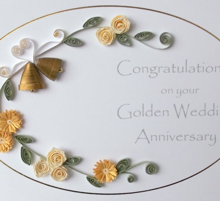 A beautiful quilled 50th anniversary card with quilling flowers and bells. An original, distinctive handmade greetings card to celebrate a milestone anniversary – a great keepsake.