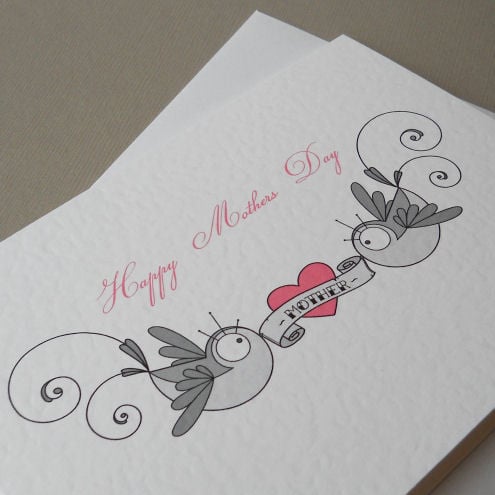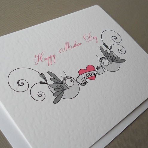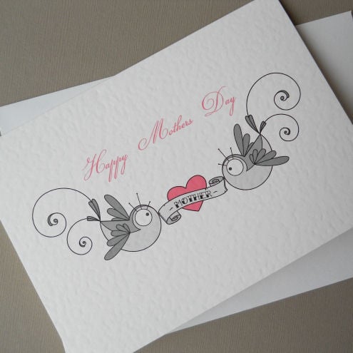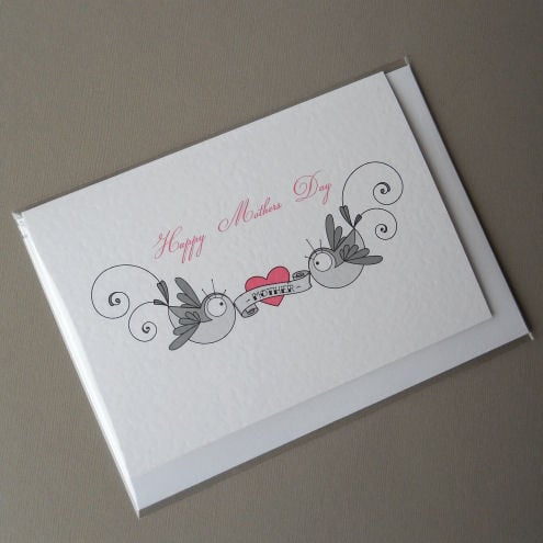 unique and quirky illustrated card, featuring a pair of retro "tattoo style" swallows, holding a heart with a scroll. the message on the card says "happy mothers day" and the scroll underneath says "mother".