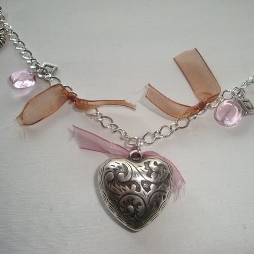 34 inch silver tone chain with toggle clasp. Large silver tone heart, foiled glass beads, organza ribbon and silver tone charms. Hangs beautifully.