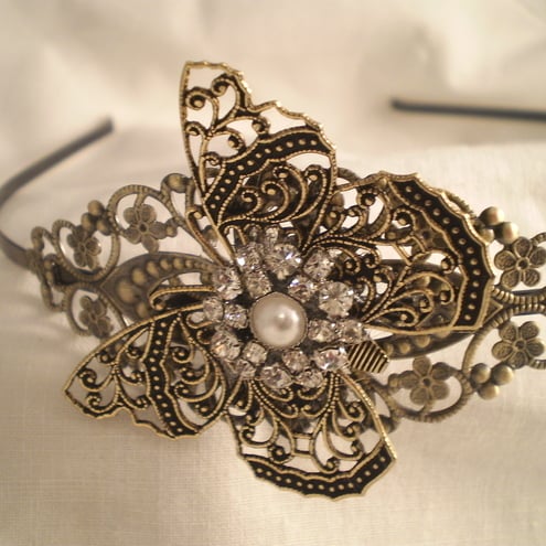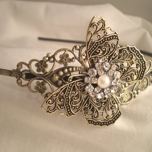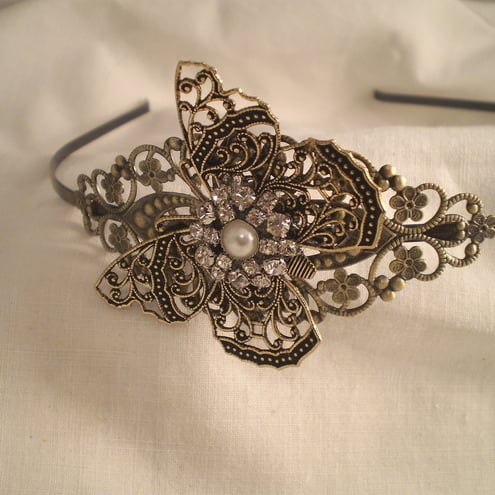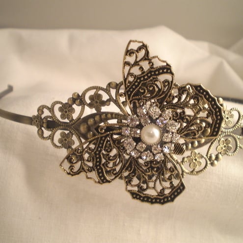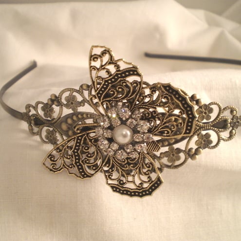 This lovely antiqued brass filigree head band has been created from a filigree butterfly stamping and a sparkling diamante button with centre faux pearl.