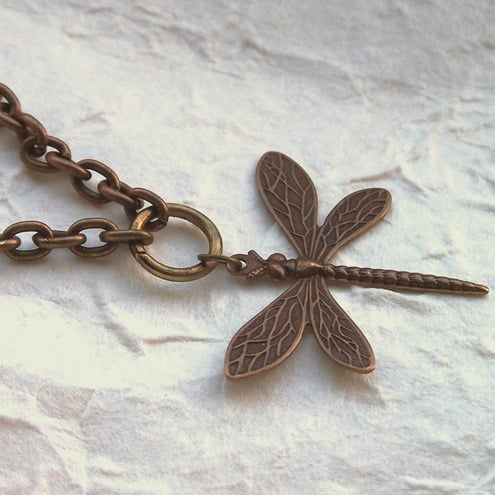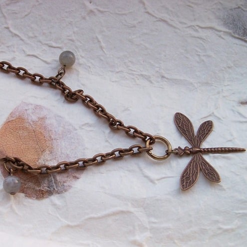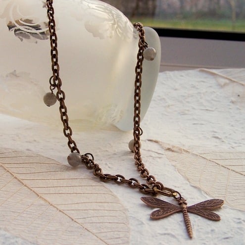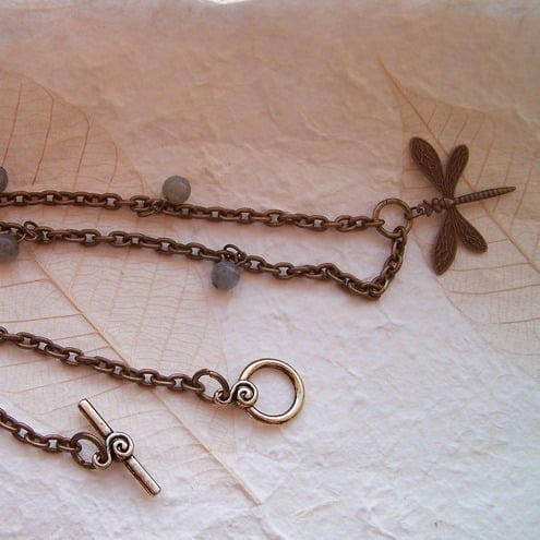 This delicate and pretty pendant features labradorite beads and a vintaj brass dragonfly, all wired onto antique brass chain and finished off with an antique gold-plated toggle clasp.
