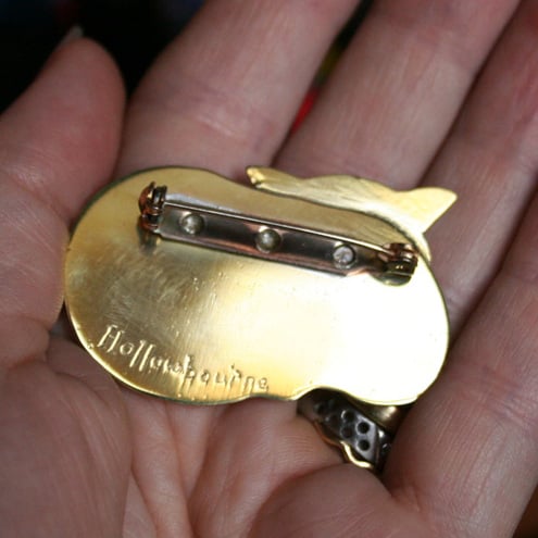 Just under 2 inches or 5cms wide, it is lacquered and has a safety catch soldered to the back.
