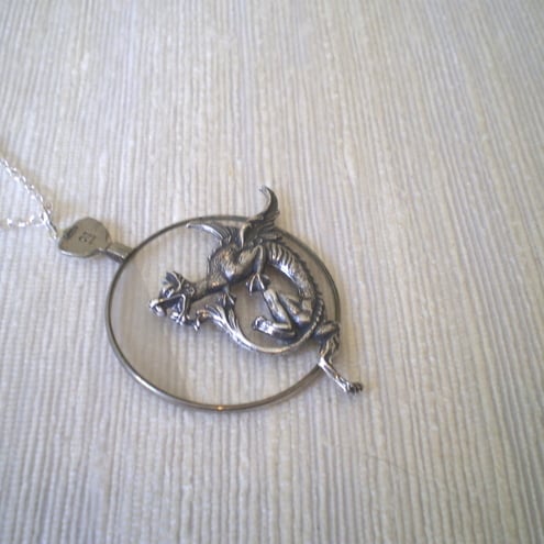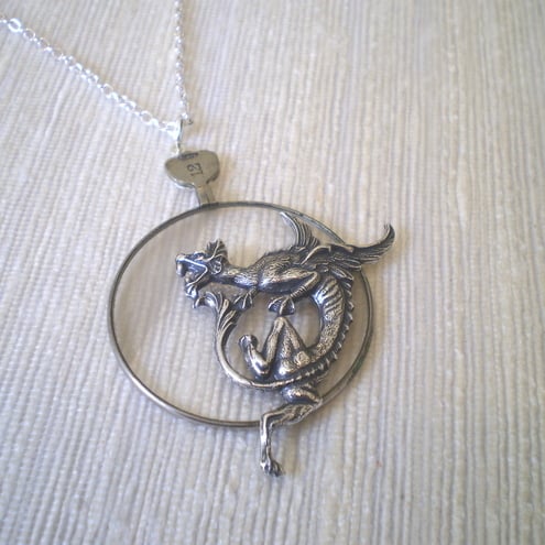 Hangs from a 18 inch silver plated chain and is 3 cms in dia. Lens measures 3 cms dia
