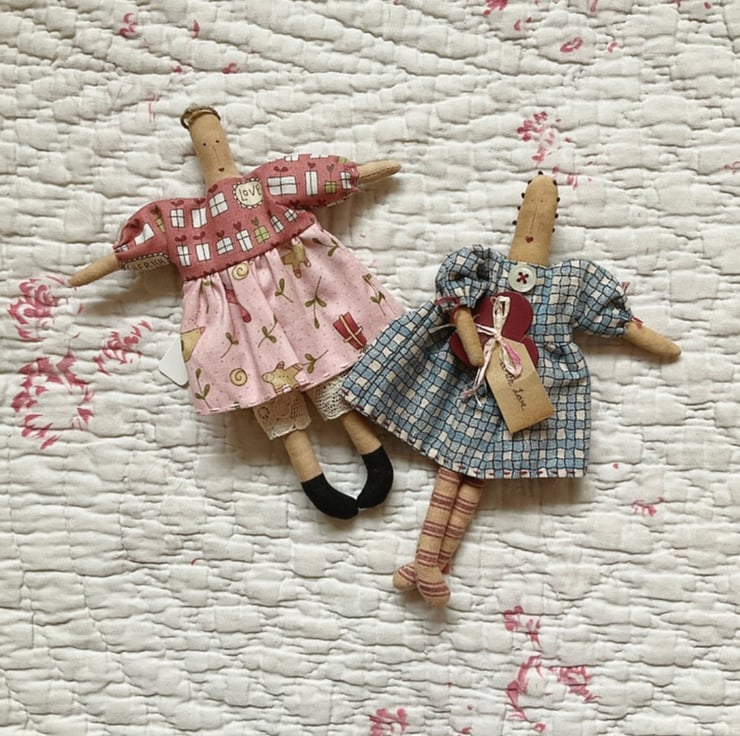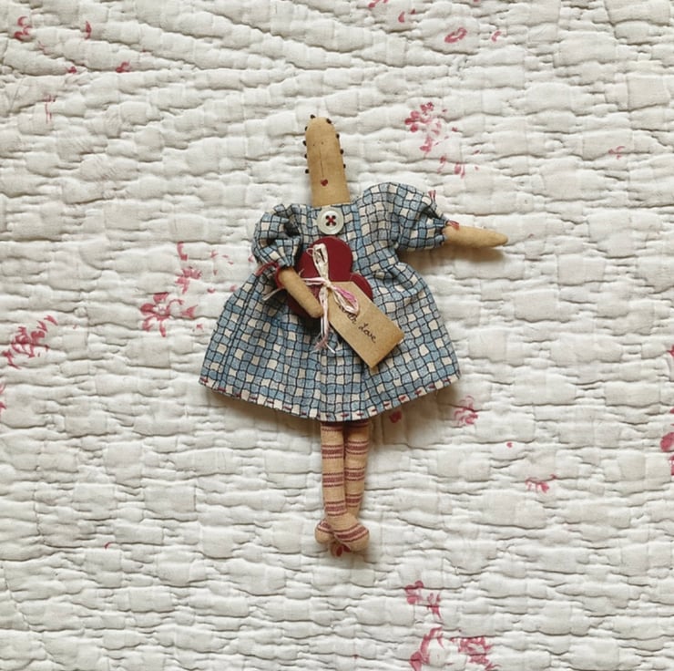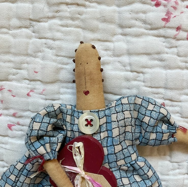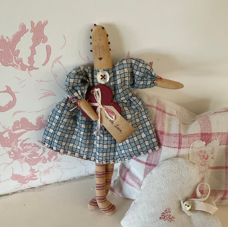 This homespun doll is hugging a painted wooden heart, featuring a mini 'with love' tag and raffia bow. She is approx 19cm long, The body is made from tea stained cotton. She has striped ticking legs and her dress is a printed homespun fabric, finished off with cuff ties and neckline button. Her facial features are drawn and painted on, with blush cheeks. Finished off with French knots.