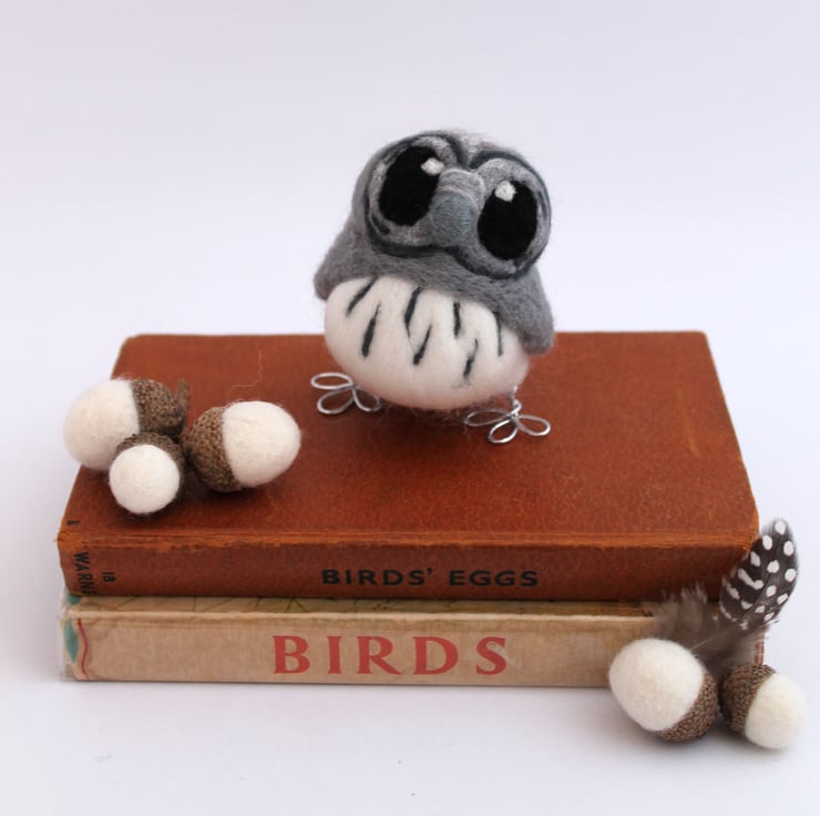 Owl babies are the smaller, cuter offspring of our big owls... they measure no more than 2.5 inches. They are needle felted from 100% organically farmed merino wooltops with beautiful paper wrapped wire legs in lovely shiny colours. They are super cute and nestle beautifully in the palm of your hand!