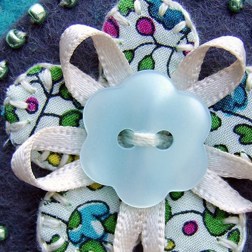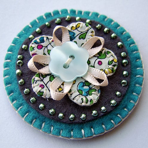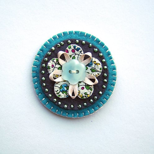 A cute little flower brooch. Featuring an appliqued flower design in pretty Liberty print fabric, mounted onto a grey felt base and edged with pretty coordinating seed beads. The flower is finished with a ribbon and button centre and is mounted onto a turquoise felt base. It has a brooch backing for easy attachment.