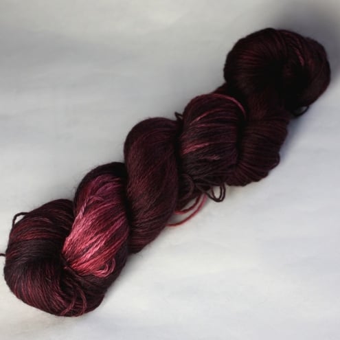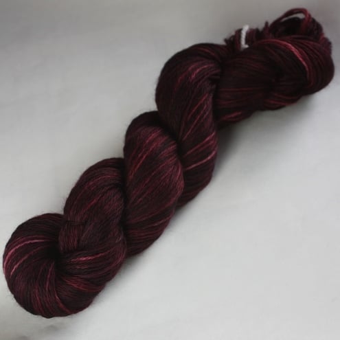 Rich and fruity, variegated dark burgundy with some lighter pinky-red areas, this soft and squishy yarn should make wonderful socks, or other projects requiring sock-weight yarn. This yarn has been reskeined but is shown before reskeining in the third photograph for reference only.