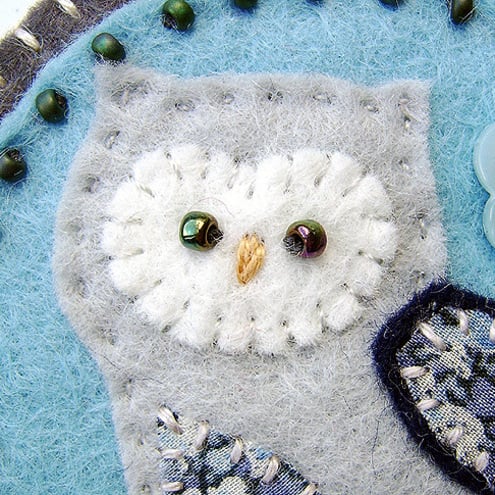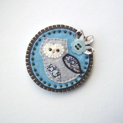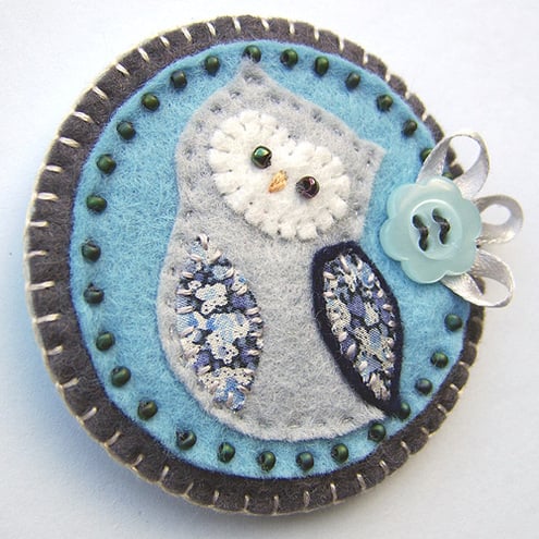It features a little owl with appliqued wing and belly in pretty Liberty print fabric. It is mounted onto a blue circular felt base which is edged with pretty coordinating seed beads. It is further mounted onto a grey felt backing and is finished with a flower button and ribbon detail. It has a brooch backing for easy attachment.