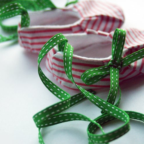 Beautiful newborn booties with contrasting green ribbon to tie round tiny ankles just like a real ballerina!! These little shoes would make an excellent baby shower gift or fabulous addition to your little fashionistas wadrobe!!!