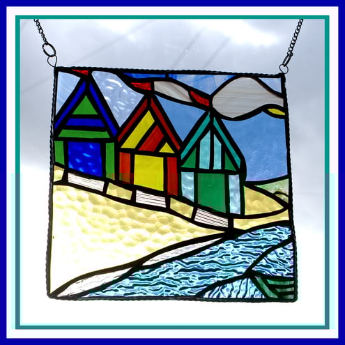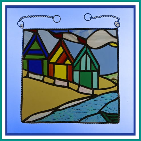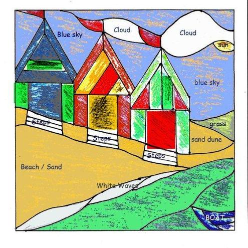 Picture shows 3 very bright ly coloured beach huts each with little steps down to the beach. The shiny sea has a line of sparkly waves up to the beach and the front (prow?) of a little boat in the corner.