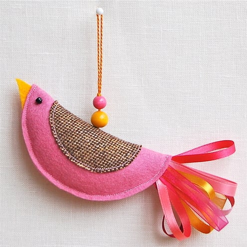 Three pink bird decorations made from wool felt and tweed, with mixed ribbon tails and glass bead eyes. Hanging threads with wooden beads.