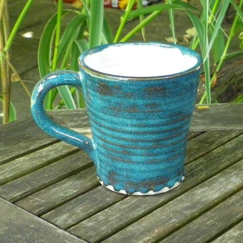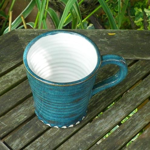 Glazed in my very favourite dark aquamarine blue reactive glaze with a clear white inside.