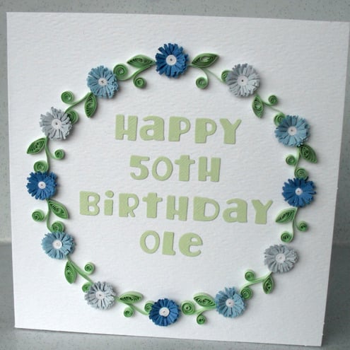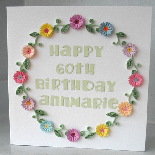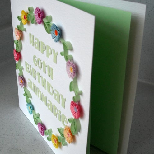 Square white textured background card featuring a personalised message, surrounded by a circular garland of quilled daisies in pretty colours with green foliage. You choose the wording for the message. This can include a name and an age of your choice. Just leave me a note of your personalisation details when you order.
