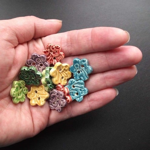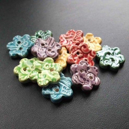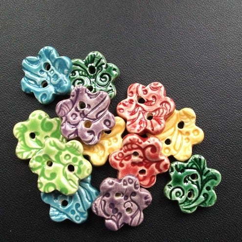 These cute little flower buttons are made from white earthenware clay and twice fired to a top temperature of 1100 degrees, so they are nice and strong.